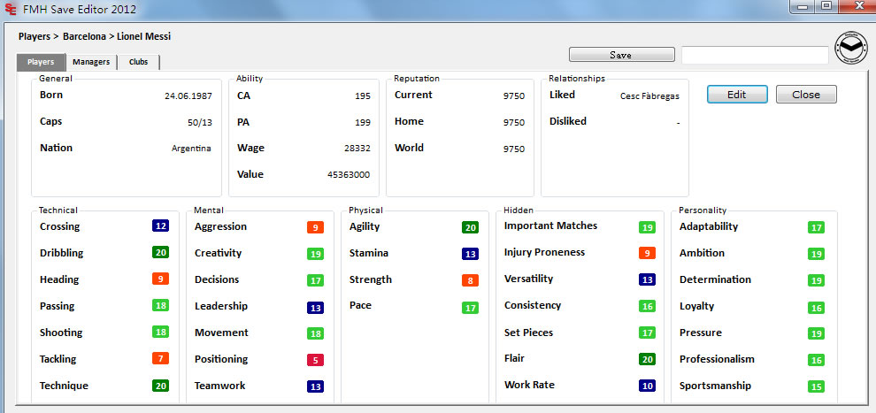 **球员和经理可以修改能力、国籍、CA、PA、所属球队等等。