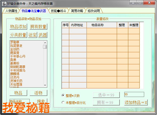 当“物品添加”按钮和“技能读取”组合框禁止时,无法向游戏加物品和技能,这时要重启游戏以刷新地址