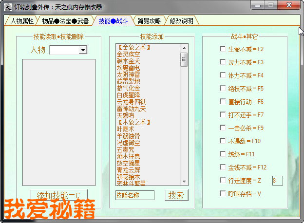 注意有些技能如果修改出来是会导致游戏出错退出的(如十邪散魂修改给靖仇将导致战斗中出错退出),什么能用请自行尝试