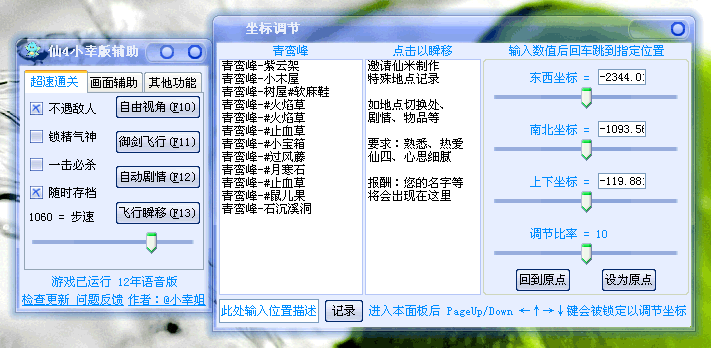 v2.0.0更新:加入【坐标调节】,和仙剑5辅助器一样,可以快速跳转也可以手动改坐标,HOME键和END键为一键跳到地图首尾(1和20)。