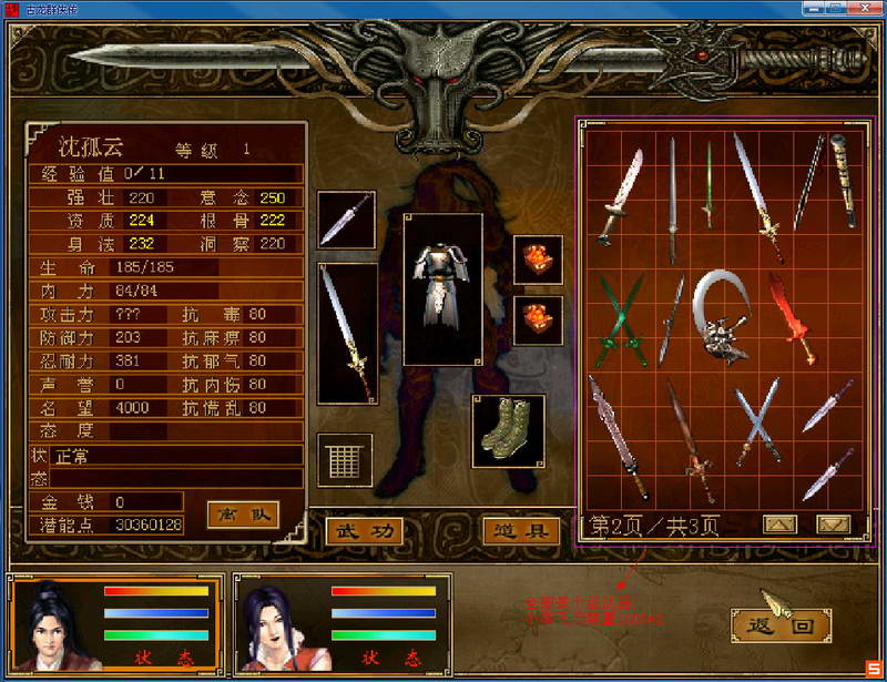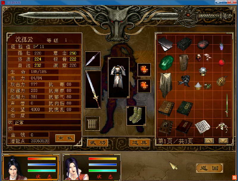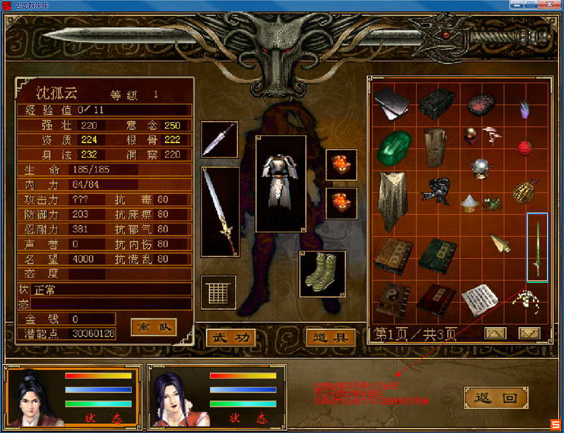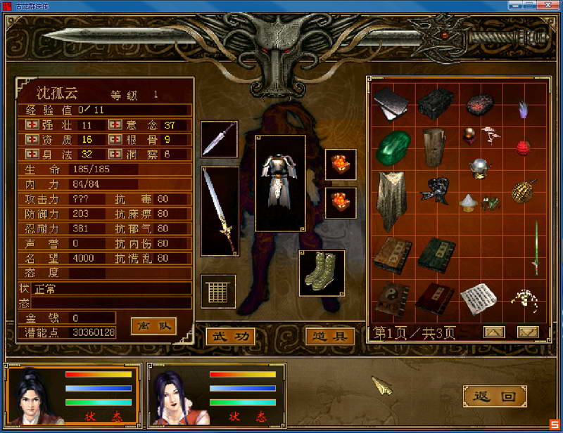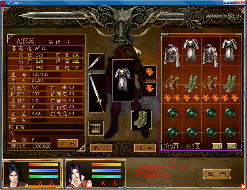 第三个存档还没有跟小师妹去后山玩,属性没有改,物品跟第二个存档一样。