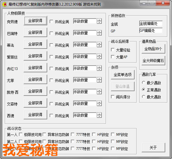 3.0版修改器中杂项除了“全菜单选项”功能可用之外,其他功能尚未开启,因为我没有那个地方的存档,按钮只是根据之前的版本做的预留,如果你需要这方面的修改,请发送给我相应的存档,我会添加相关内容。另外遇敌功能尚未最优化,等我有空慢慢改吧。