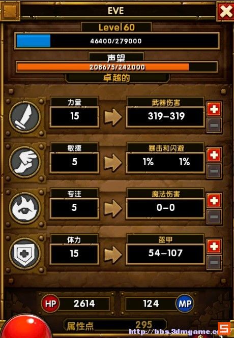 人物为60级 有295点属性点 75点技能点(60点+15点荣誉的)可加