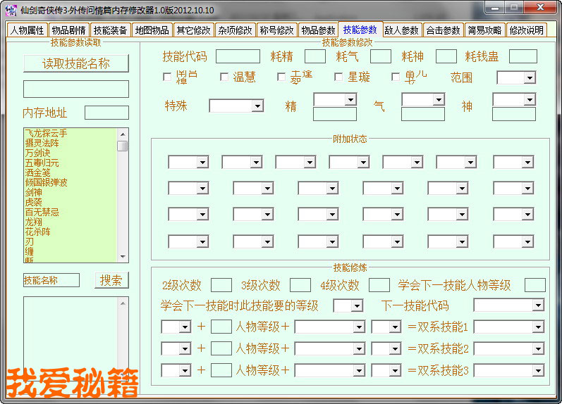 可以把其它任何技能修改给主角,但修改后只能在战斗中能看到,而且修改出来的技能不是游戏指定的技能会造成在人物升级和人物技能升级时出错,可能通过修改技能参数的方法来修下