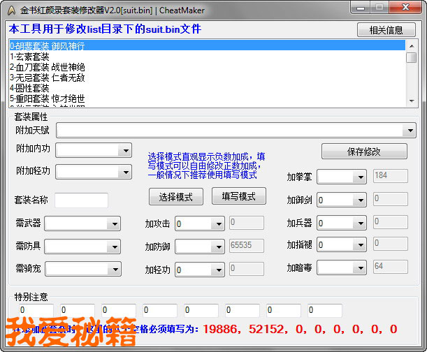 经测试3.0不能修改内存,但可以修改文件,所以套装修改器还能用,武功配合因为我没老模板所以做不了,凑活用吧