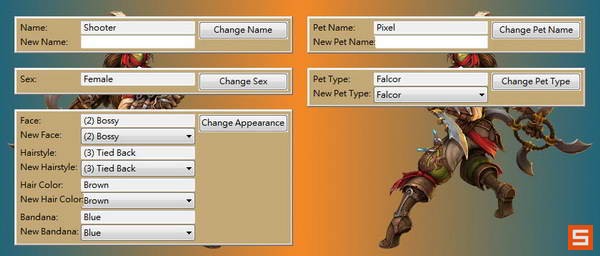 允许玩家自由地修改角色的名字 (不支持中文和特殊字符)、脸型,髮型、髮色,头巾颜色 (仅限漂泊者)、宠物名字和宠物类型。