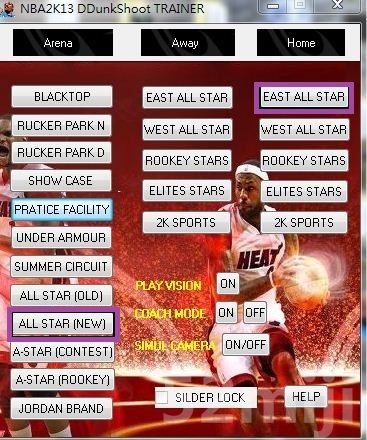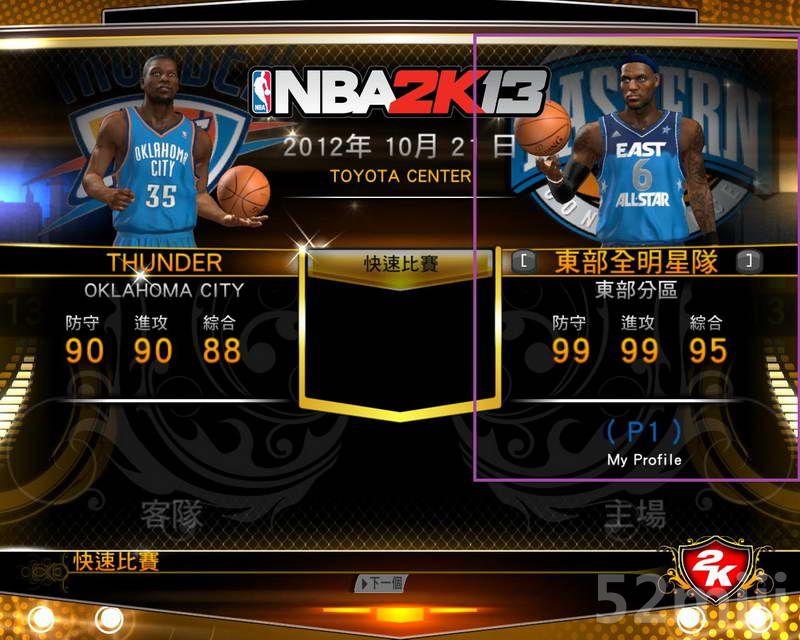 再开程式,Arena选场馆,Away、Home分别选客队和主队。例如我选全明星场(All Star(NEW)),在主场选东部全明星。(看图紫色框的)