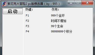 今天无聊做了个修改器,功能嘛有999个金环,99个生命,时间不增加和99999999个积分。废话不多说,直接发图