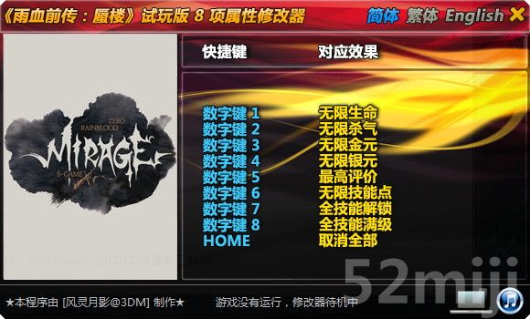 | 2012.12.26 | 雨血前传:蜃楼试玩版修改器 + 8 | 试玩版Demo | +8 |