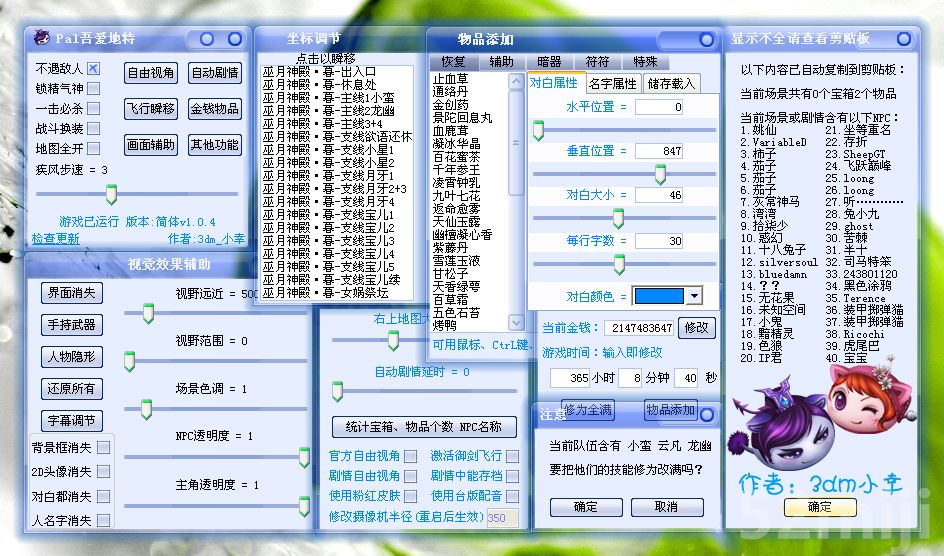 v1.6 更新内容:修为全满,物品添加,以及上个版本的某些瑕疵。(物品添加完毕后,另存新档,再读取该档,这次不知为何添加完不能直接使用)