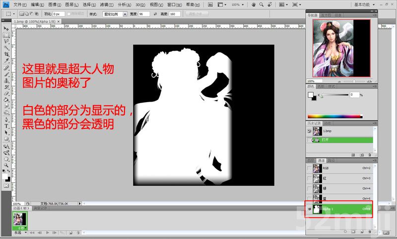 用photoshop打开导出的*.bmp图片,可以看到有alpha通道