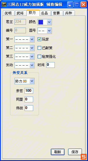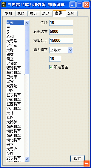《三国志12:PK版》辅助编辑器,可修改武将、势力、名品、官爵、兵种等。