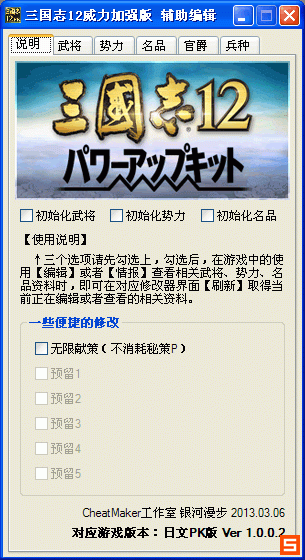 | 2013.03.07 | 三国志12:威力加强版多功能修改器 | 日文PK版v1.0.0.2版 | - |