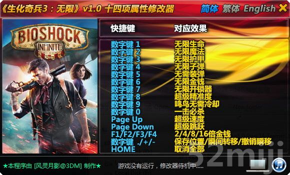 | 2013.03.29 | 生化奇兵:无限v1.0修改器 + 14 | v1.0/汉化版 | 更新+11/+14 |