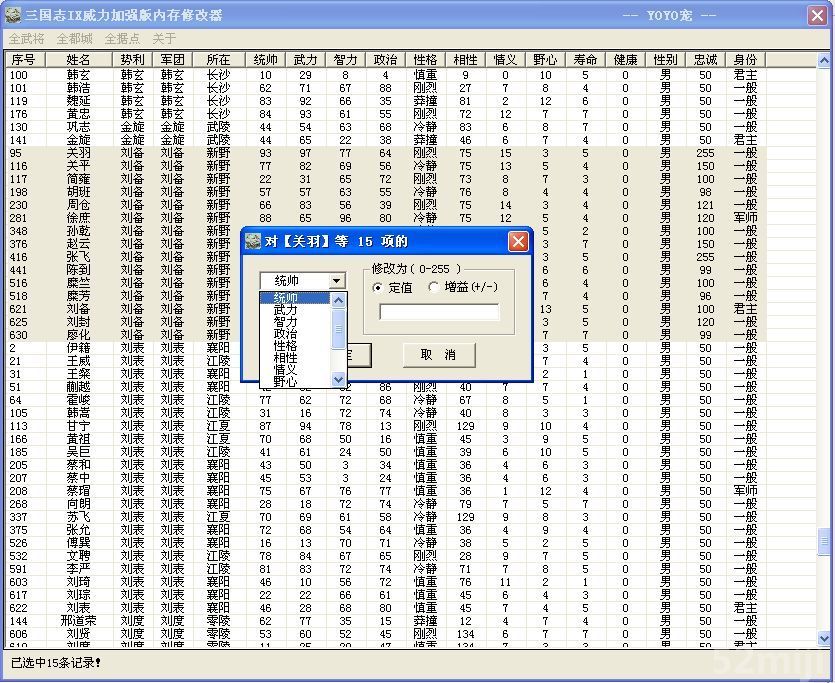 主要提供武将、都市、据点的属性、兵法批量修改、查阅。多项修改中的增益模式是在原值基础上进行增减(程序本身对数据是有逻辑保护的,超出上下限会自动靠齐,可以随意修改)