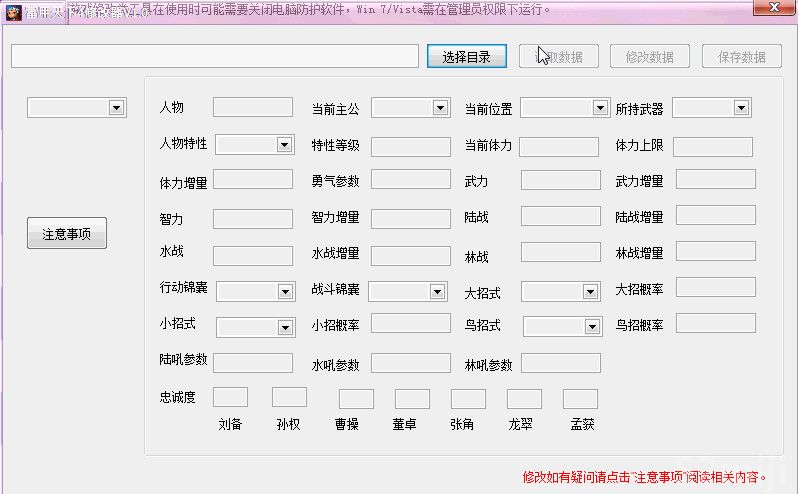 2.目录软件版本为1.0版,请合理范围内修改,注意备份,修改数值过大或过小造成数据溢出,程序出错,与软件本身无关。