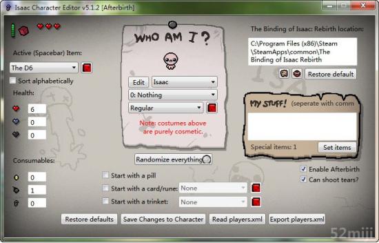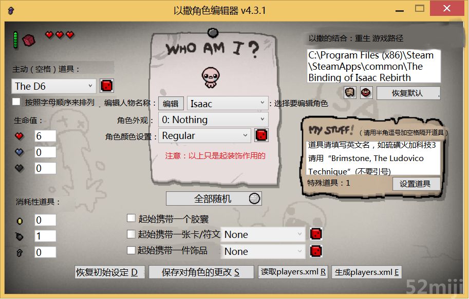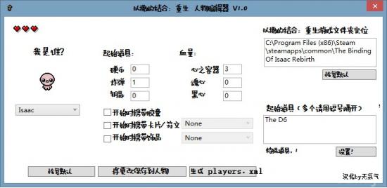 介绍:Isaac Character Editor可以让你编辑各个角色的姓名,初始外观,金钱,炸弹,钥匙,血量,饰品,胶囊,卡牌 以及初始道具!
