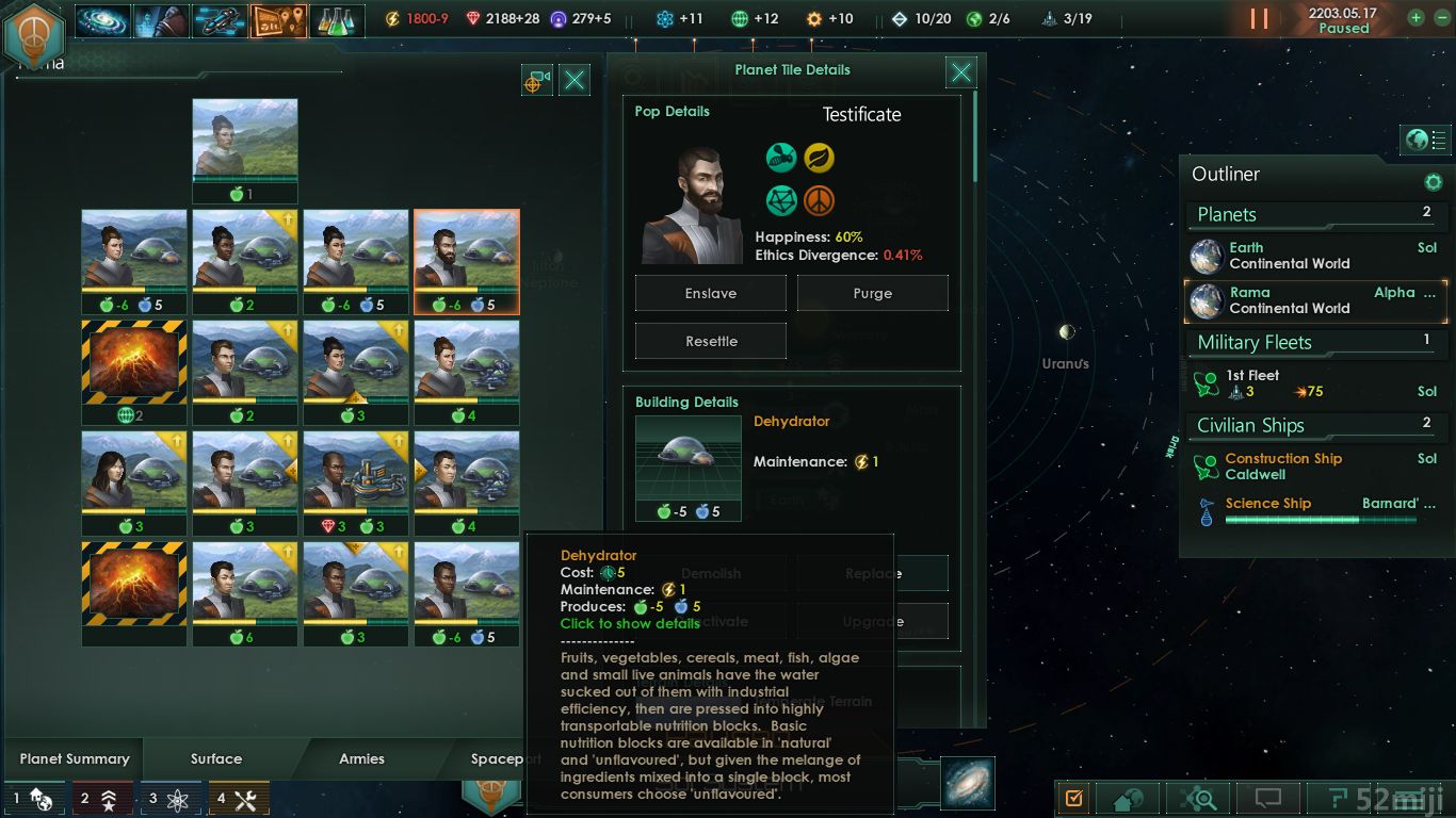 这个作者设立了一种叫“储存食物”的战略资源,然后通过不同建筑制造和消耗这个资源来模拟食物脱水/水化的过程以实现跨星球使用。