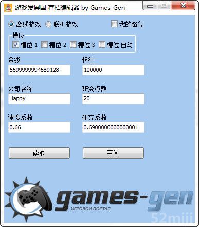可修改游戏存档槽位、金钱数量(最大值5700000000000000)、粉丝数量、公司名称、研究点数及速度和研究系数,支持离线及联机游戏;并支持自定义存档位置。