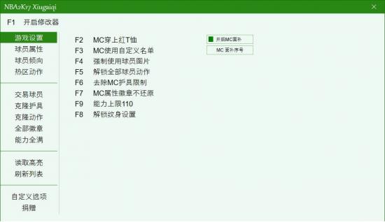 10051044: 将原来的F2功能替换为zidingyi.txt中的“解锁MC隐藏选项”,添加伤病天数修改,“球员交易”功能现在禁止同队交易。