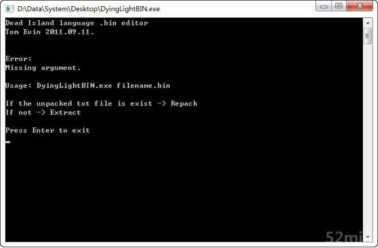 4、打包: *.bin.txt 修改好后保存。注意:这个时候打包仍然是将原 *.bin 文件拖放到 DyingLightBIN.exe 上,形成一个 *.bin2 文件;