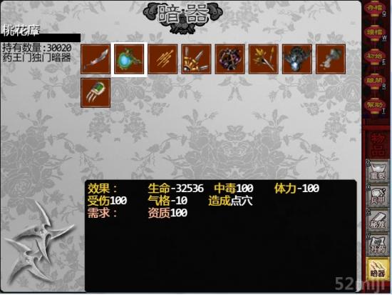暗器:桃花瘴伤害3万,中了必死,其他看图。