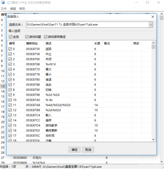 菜单“文件”--“数据导入”:选择一个要导入的三国志11PK EXE文件,并选择要导入的条目,并勾选要导入的游戏保存路径与游戏标题。