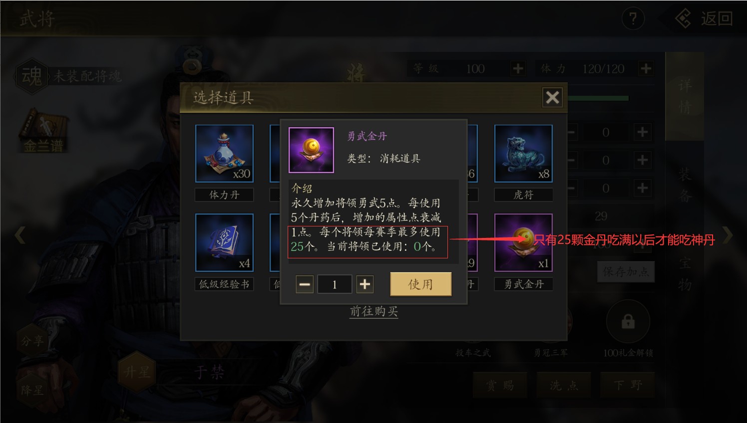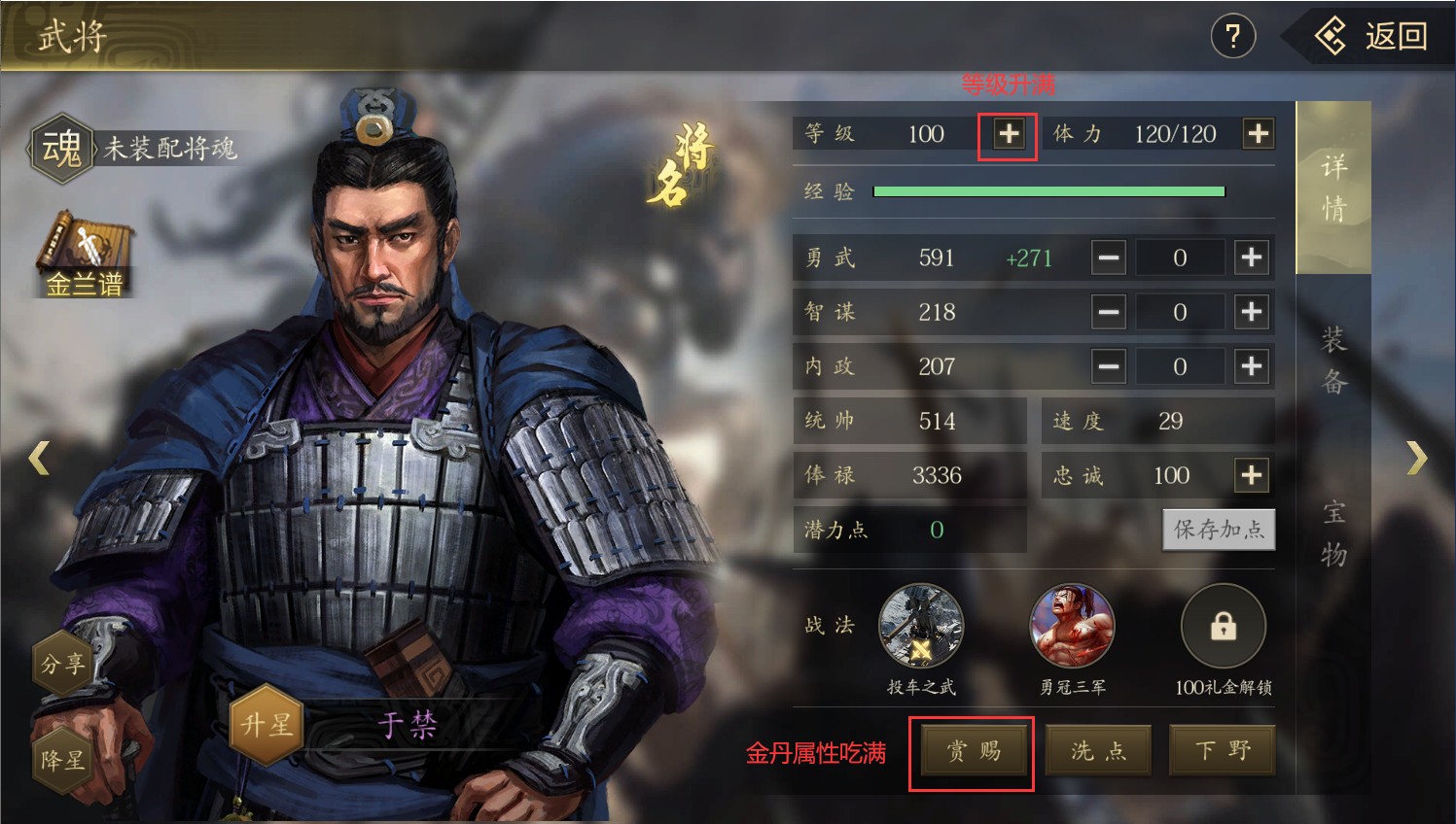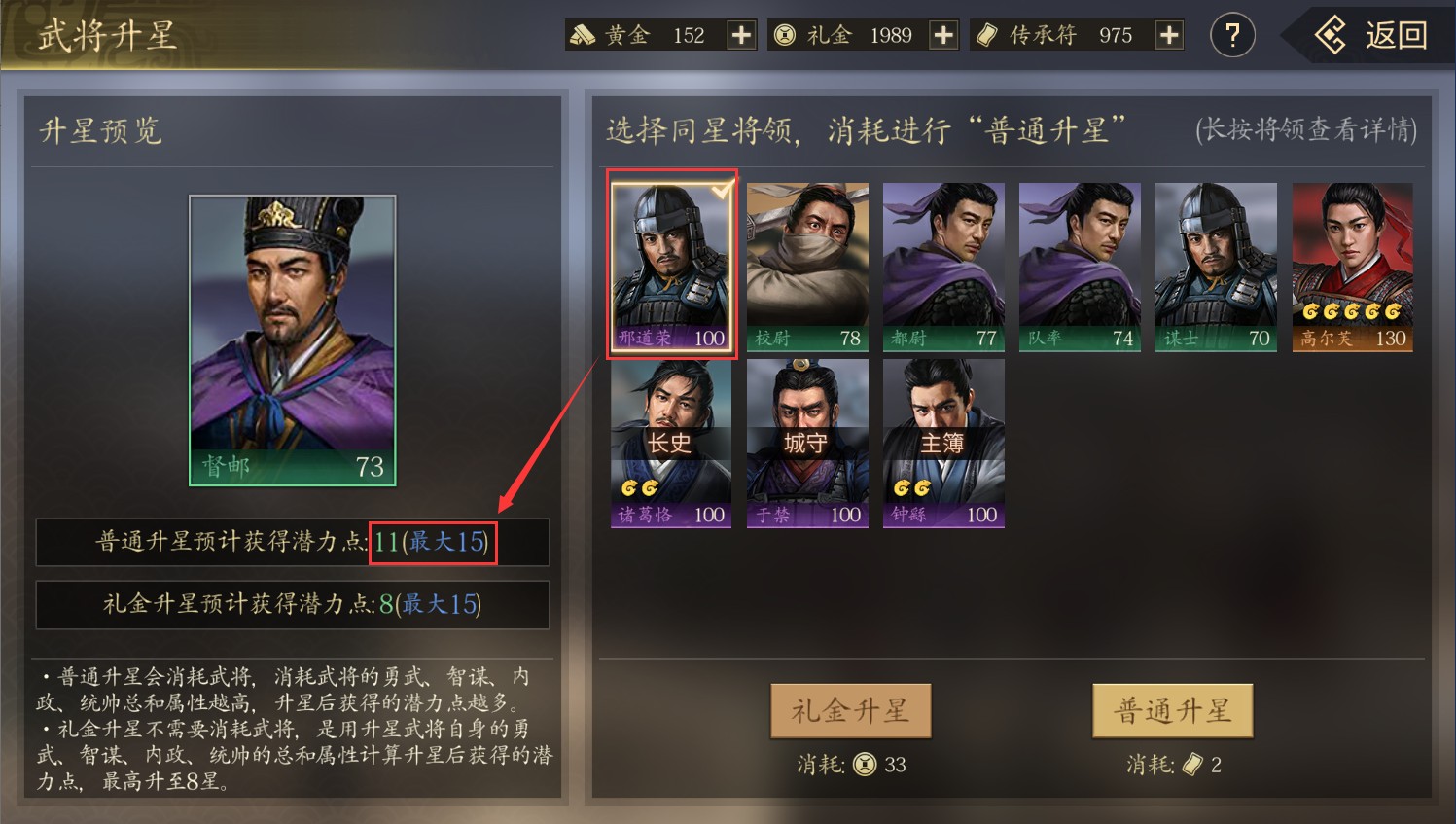 根据公式不难看出,我们要通过普通升星尽可能获得多的潜力点就需要提高被消耗的材料武将四维属性,常用的办法就是获取高基础值的名将(名将稀有度越高,其四维总和也越高)作为材料武将,然后就是提升该武将的等级(等级的提升会自动增加统帅值)、洗点(将领首次洗点会获得额外可分配的属性点)、赏赐将领金丹来再次提升其四维属性。