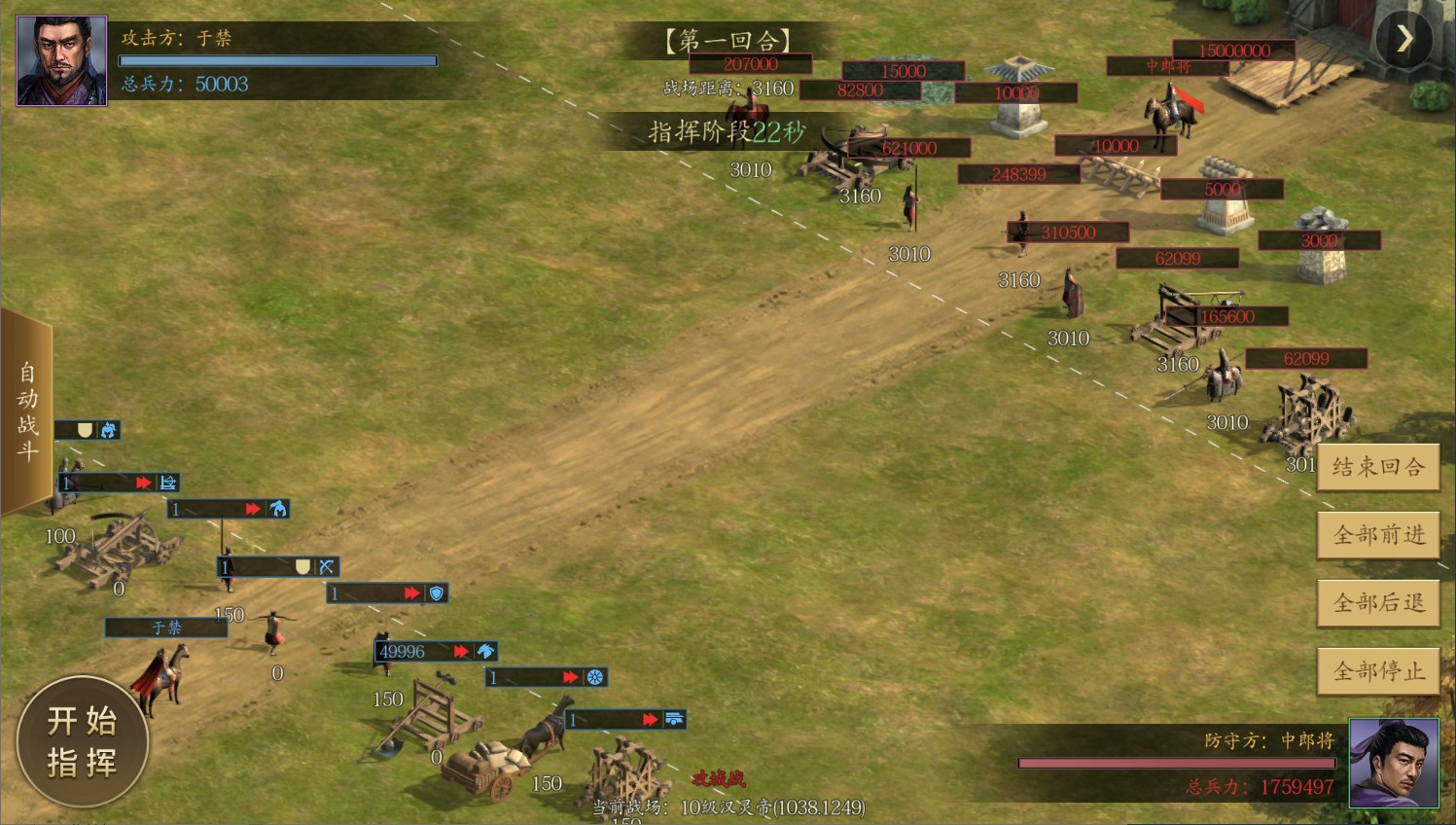 直到清扫完敌方近程兵,开始前进所有兵种并设置我方投石车攻击目标为敌方投石车。当我方投石车击中敌方投石车后,设置我方投石车停止。然后依次进攻敌方床弩、弓箭兵,直到胜利。