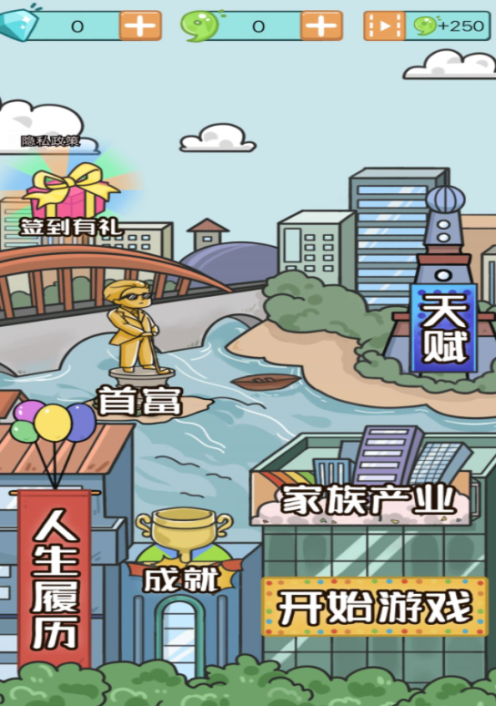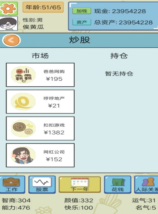 成为有钱人, 文字 点击经营小游戏。 采用模拟人生玩法,你将开始规划你的人生。记得重启人生,调整背景和学习属性,尽情享受有钱人的生活。