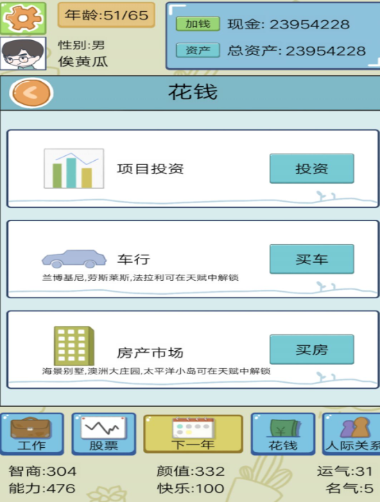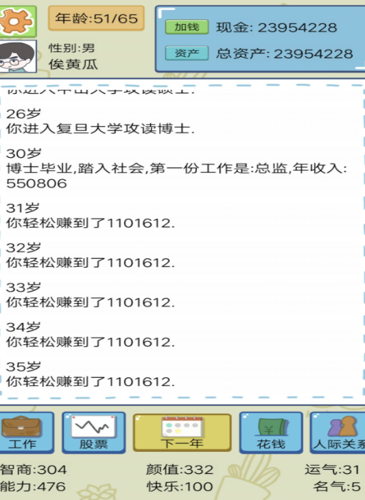 每一年都要自己努力升属性。建议投胎投父母至少有一个收入条满50%的