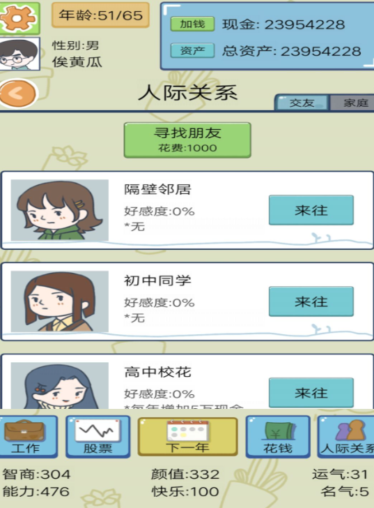 模拟人生类游戏,在里面你可以从头开始扮演一个 人物 ,选择不同的人生来度过一生,各种各样的职业都可以自由地尝试,充满中国特色的 娱乐 玩法让你体验各种不同类型的生活,无论是从商还是从政,成为小人物还是大人物都可以通过自己的努力来实现。