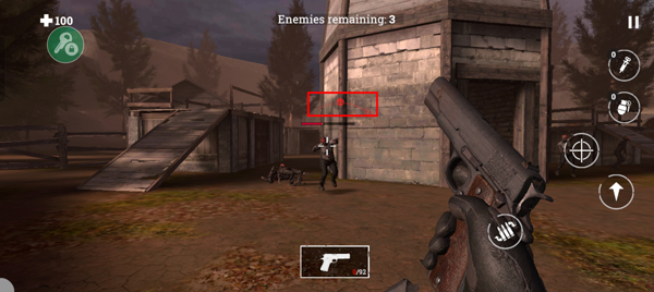 4、滑动左下角的摇杆进行移动进行移动,当面临许多僵尸的时候,我们利用障碍来逐个击破僵尸;