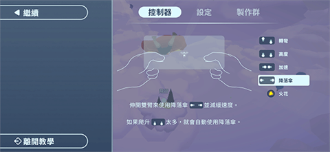 4、降落伞:将左右大拇指同时向外滑动来伸开双臂使用降落伞并减缓速度。