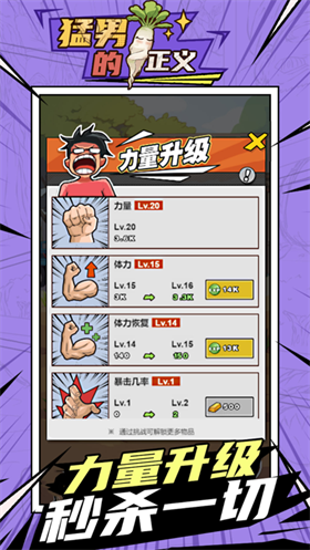 硬汉正义手游为玩家提供了一款充满乐趣和魔性的休闲游戏。在游戏中,玩家将参与健身活动,目标是挖掘埋在土里的萝卜,从而踏上锻炼之路。通过放置式的锻炼玩法,玩家可以迅速增强体力。游戏中还有众多丰富的道具等待探索,帮助你成为一位强壮的肌肉硬汉,开启奋斗的人生旅程。