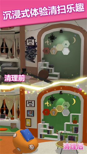 这款游戏包含极其有趣的清洁挑战,提供大量丰富工具供玩家自由使用,清洁房间内的灰尘和污渍,将每个物品有序摆放,体验从杂乱到整洁的整理过程,享受每个房间清洁后的成就感,尽情释放压力。