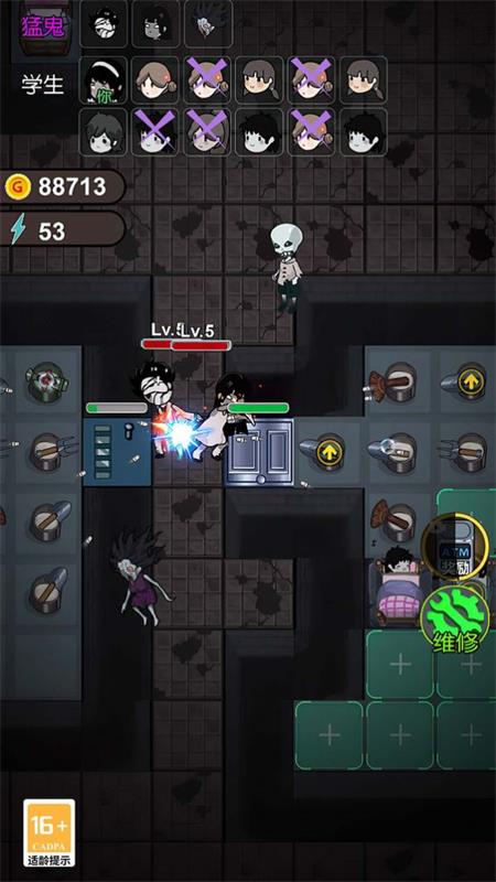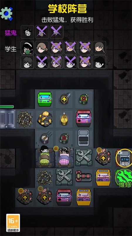2)游戏采用独特的塔防策略玩法,玩家需要进行精心布局来形成强大的防线,保护自己的宿舍不被猛鬼侵袭。