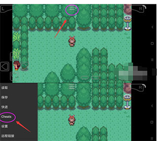 1、在手机上启动gba模拟器,进入游戏后,点击以下图标,选择 Cheats;