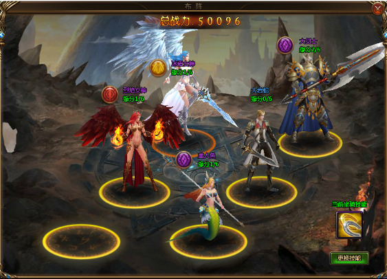 出战英雄:主角、大剑士(肉盾)、冰霜女神(群体输出)、烈焰女神(群体输出)、美人鱼(治疗)