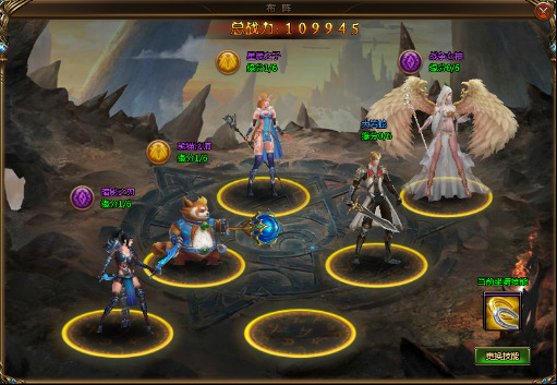 出战英雄:主角、大剑士(肉盾)、烈焰女神(群体输出)、帝国戍卫(单体输出)、美人鱼(治疗)