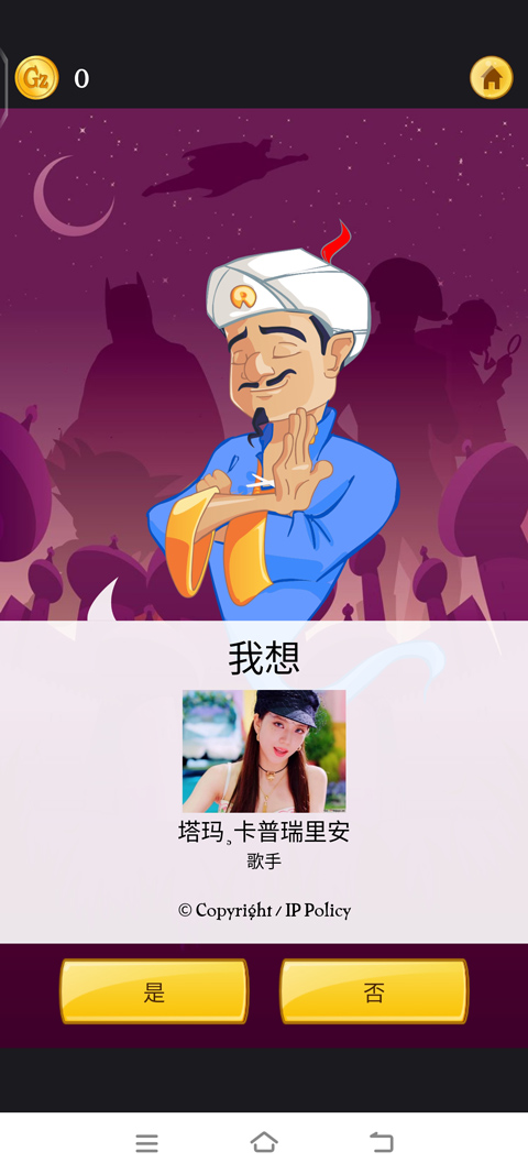 与此同时,游戏玩法既简单又有趣。在游戏开始之前,玩家能够挑选一种人物设定,比如政治家、娱乐明星,亦或是著名卡通角色等等。点击开始后,灯神会提出一连串的问题,玩家仅需点击“是”“否”或者“不知道”这类回答。经过数轮问答,这位“网络天才”便会说出玩家心中所想的答案。