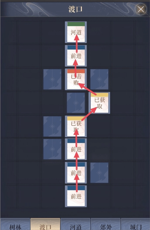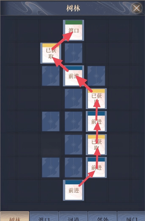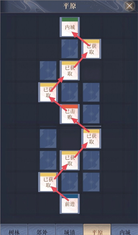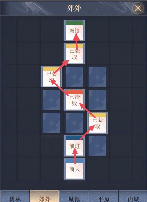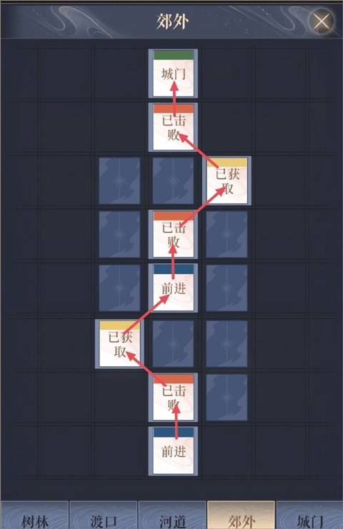 郊外→树林1→郊外→树林1→河边→树林2→洞口→内城→绣衣楼(终点)