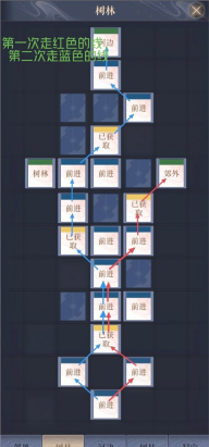 其中树林1(p2)需要先走红色的线回到郊外,郊外再走一次到达树林1,再走蓝色的路线
