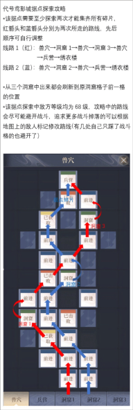 线路1(红):兽穴→洞窟1→兽穴→洞窟3→兽穴→兵营→绣衣楼