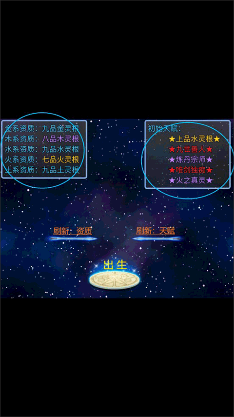 进入之后,系统会随机为我们分配灵根与天赋。灵根自然是等级越高越理想,天赋方面,红色且与自身灵根适配的为佳。大家不必担忧运气欠佳,因为在此处,灵根和天赋都能刷新,并且次数不受限制,是不是考虑得很周到呀?