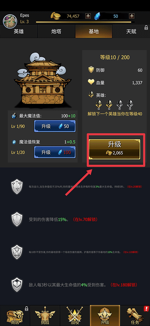 另外我们还可以在基地界面中为基地进行升级来提升他的防御能力等