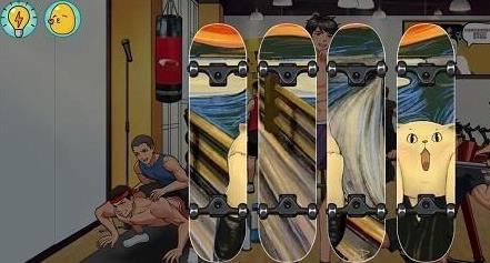1、将右侧滑板拖至玩电脑的男生身上,男生瞬间变身“潘周聃”,随后踩着滑板潇洒离场。