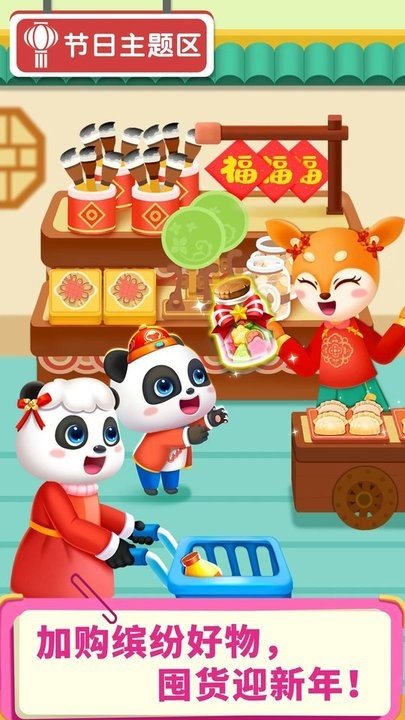 1、【超市商品丰富】:超市货架上琳琅满目:蛋糕、汉堡、西瓜、巧克力、玩具、鱼类、时装、口红……生活用品一应俱全。包括灯笼、福字、红包等宝宝想买的年货,都可以在【宝宝超市】找到!