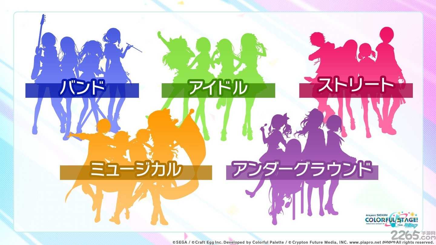 本作设有风格迥异的五组新角色,各自代表不同的音乐风格。包括「乐团(バンド)」、「偶像(アイドル)」、「街头(ストリート)」、「音乐剧(ミュージカル)」、「地下(アンダーグラウンド)」五种。初音未来一行人亦将以他们的风格在「SEKAI」中登场。