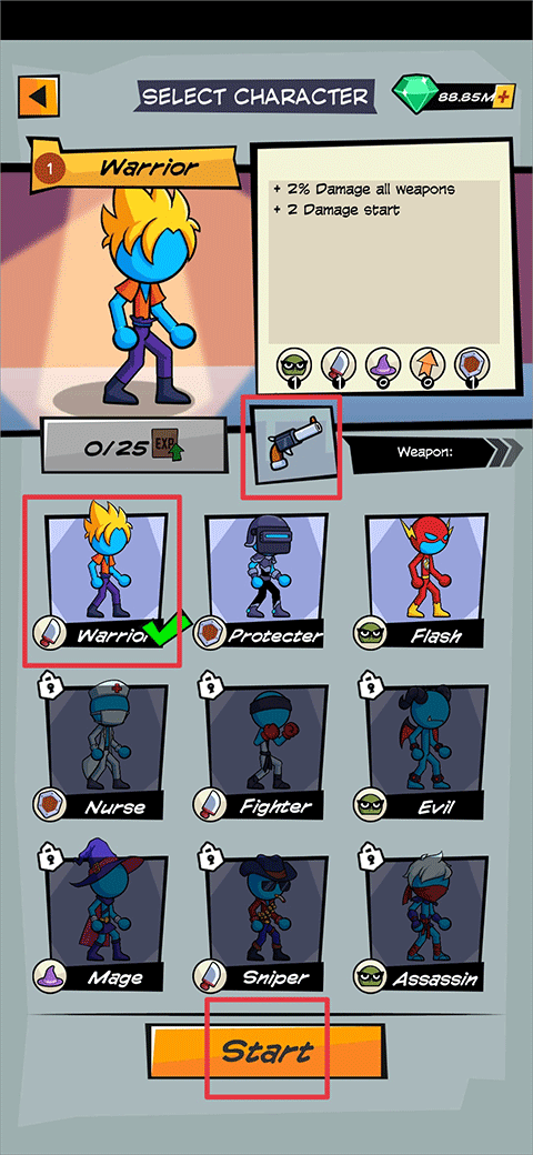 2、然后再英雄界面中选择一个喜欢的英雄,每个英雄使用的武器是不同的哟。选择完成后点击start开始游戏